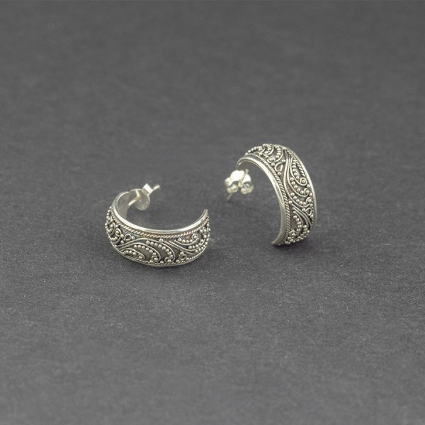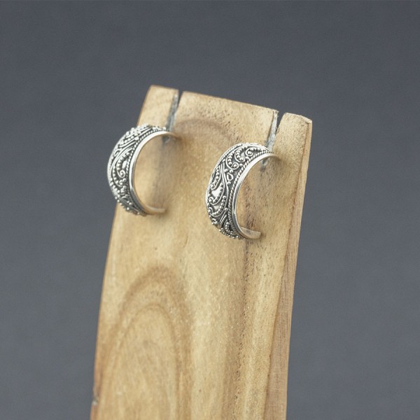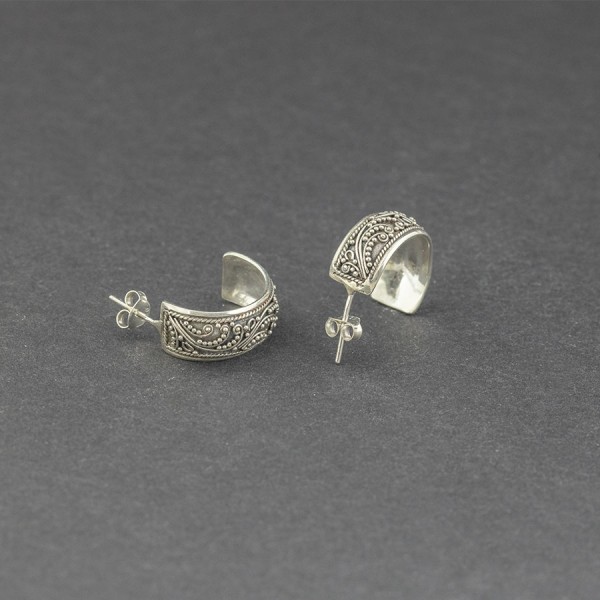 Kolczyki w formie półkola wykonane ze srebra próby 925. Całość zdobień wykonana została ręcznie pracochłonną techniką granulacji. Szerokość obręczy kolczyka 8 mm. Długość kolczyków 1,9 cm.