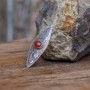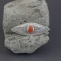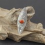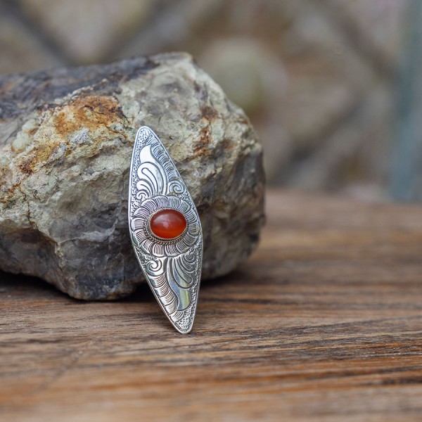 Broszka z orientalnym akcentem wykonana ręcznie ze srebra próby 925 z oprawionym kamieniem karneolu. Całkowicie ręcznie z niebywałą precyzją, wyrzeźbiony został motyw typowy dla balijskiego wzornictwa. Wielkość kamienia 8x10 mm. Wielkość broszki 19x57 mm. Unikat pochodzący jeszcze z ubiegłego wieku. Polecam osobom kolekcjonującym broszki jak i miłośnikom unikatowych przedmiotów.