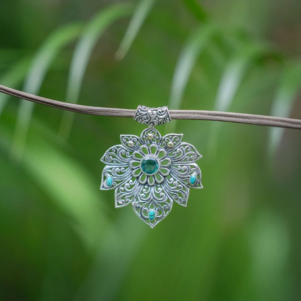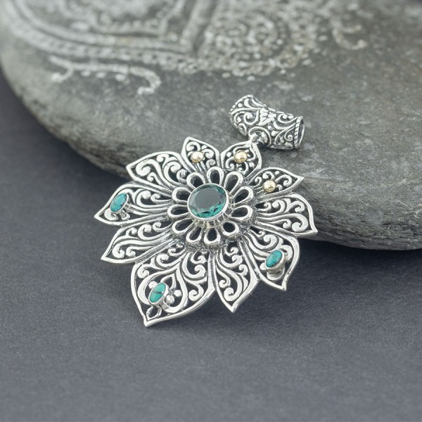 Wyjątkowy wisior od podstaw wykonany został ręcznie ze srebra próby 925 oraz 18-karatowego złota. W centrum oprawiony został kamień kwarcu zielonego (8 mm). Dół ozdabiają turkusy (3x5 mm). Wielkość tarczy wisiorka 48x47 mm. Długość wisiorka 5,6 cm.