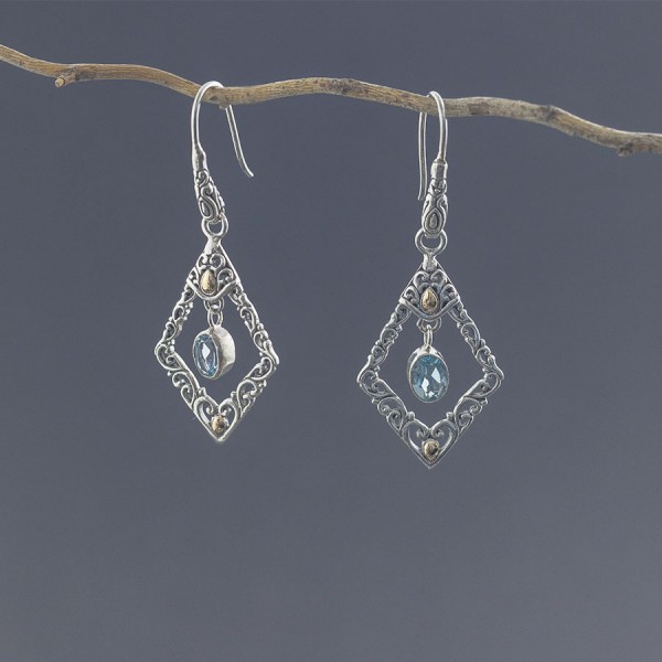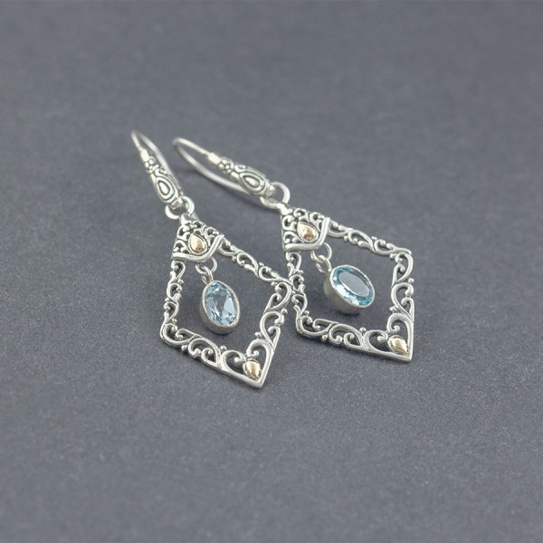 Eleganckie kolczyki w orientalnym stylu od podstaw wykonane ręcznie ze srebra próby 925 oraz 18-karatowego złota. Kolczyki ozdabiają kamienie błękitnego topazu wielkości 5x7 mm. Wielkość tarczy kolczyka 32x21 mm. Długość całkowita kolczyków 5,5 cm.