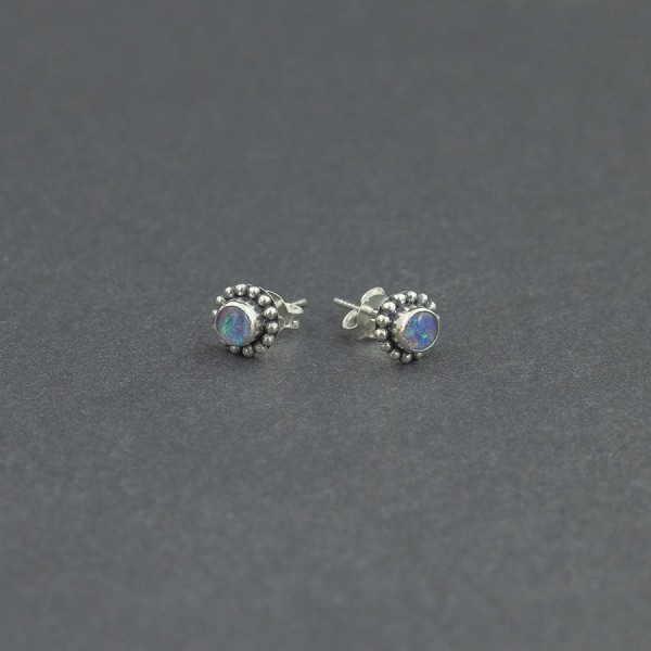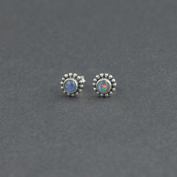 Kolczyki - sztyfty wykonane ze srebra próby 925 z oprawionymi kamieniami opalu australijskiego (typu triplet). Wielkość kamienia 4 mm. Wielkość kolczyków 7,5 mm.