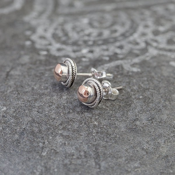 Kolczyki - sztyfty wykonane od postaw ręcznie ze srebra próby 925 oraz 18-karatowego złota. Wielkość kolczyków 7,5 mm.