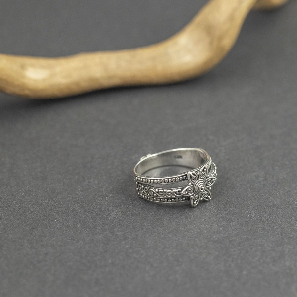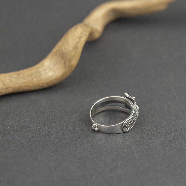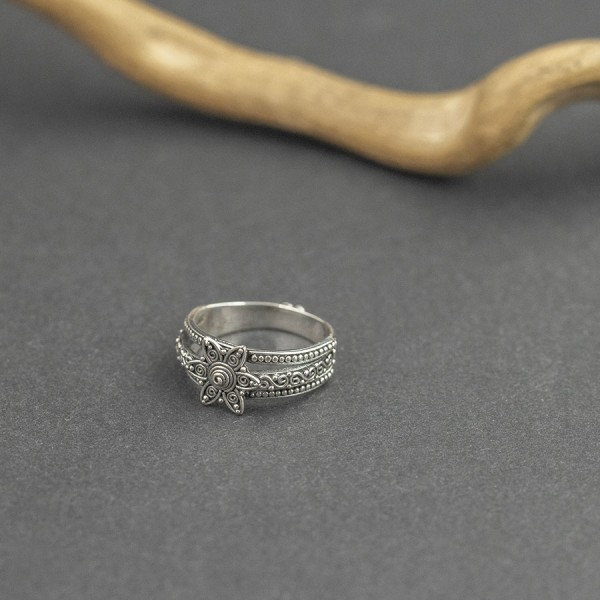 Pierścionek od podstaw wykonany ręcznie ze srebra próby 925. Całość zdobień wykonana została ręcznie pracochłonną techniką granulacji. Wielkość tarczy pierścionka 11 mm. Pierścionek występuje w rozmiarze jubilerskim 13,15 i 17 (wybrany rozmiar pierścionka proszę podać w komentarzu do zamówienia).