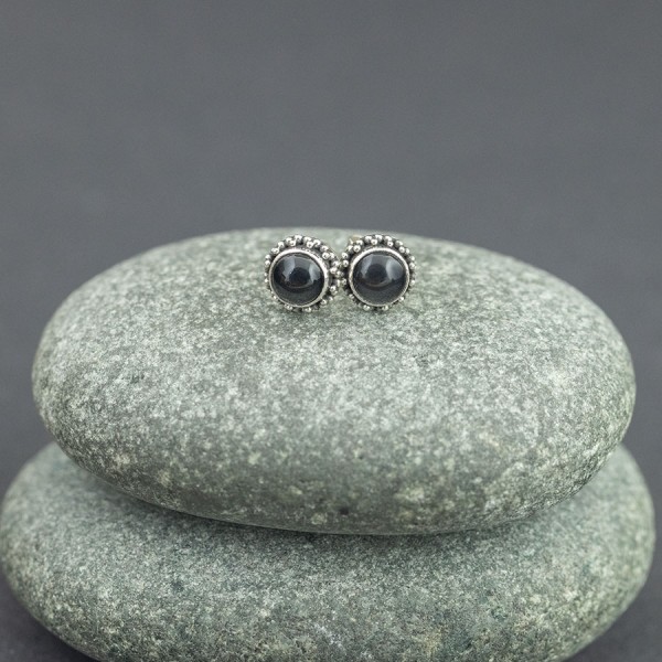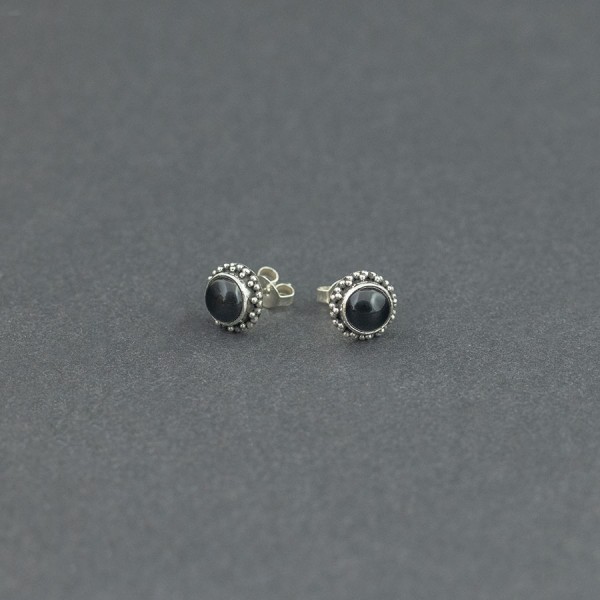 Kolczyki - sztyfty wykonane ze srebra próby 925 z oprawionymi kamieniami onyksu. Wielkość kamienia 6 mm. Wielkość kolczyków 9 mm. Całość zdobień wykonana została ręcznie pracochłonną techniką granulacji.