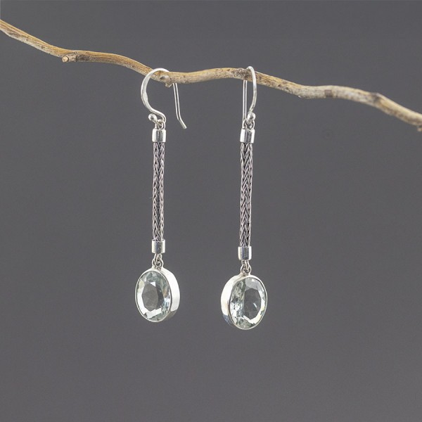 Kolczyki od podstaw wykonane zostały ręcznie ze srebra próby 925 oraz kamieni zielonego ametystu. Wielkość kamieni 10x12 mm. Grubość łańcuszka 2 mm. Długość całkowita kolczyków 5,9 cm. Pojedynczy egzemplarz