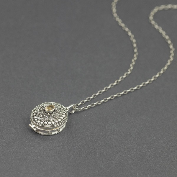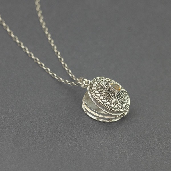 Srebrny wisior w formie sekretnika, wykonany ręcznie, z misternie zdobioną powierzchnią i oprawionym kamieniem cytrynu (4x6 mm). Sekretnik jest otwierany, do środka można włożyć zdjęcie lub bliski nam przedmiot. Elementy wykończeniowe wykonane z oksydowanego srebra próby 925. Wielkość sekretnika 2,4x2 cm. Długość całkowita wisiora 3,6 cm. Doskonały na prezent dla bliskiej osoby.