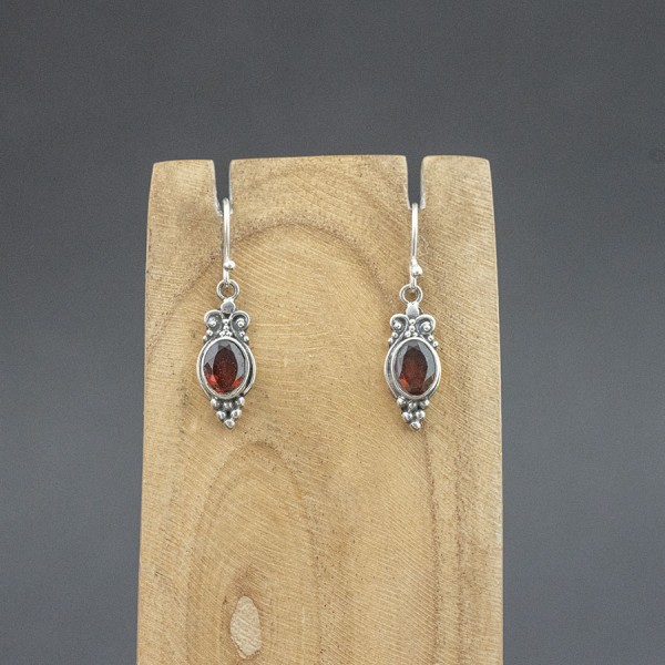 Kolczyki od podstaw wykonane ręcznie ze srebra próby 925 oraz kamieni granatu. Wielkość kamienia 6x8 mm. Wielkość tarczy kolczyka 8x18 mm. Długość całkowita kolczyków 3,3 cm. Całość zdobień wykonana została ręcznie.