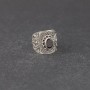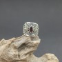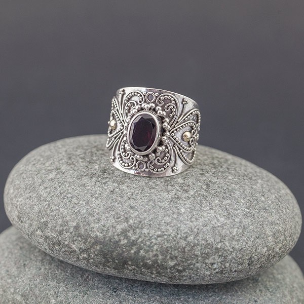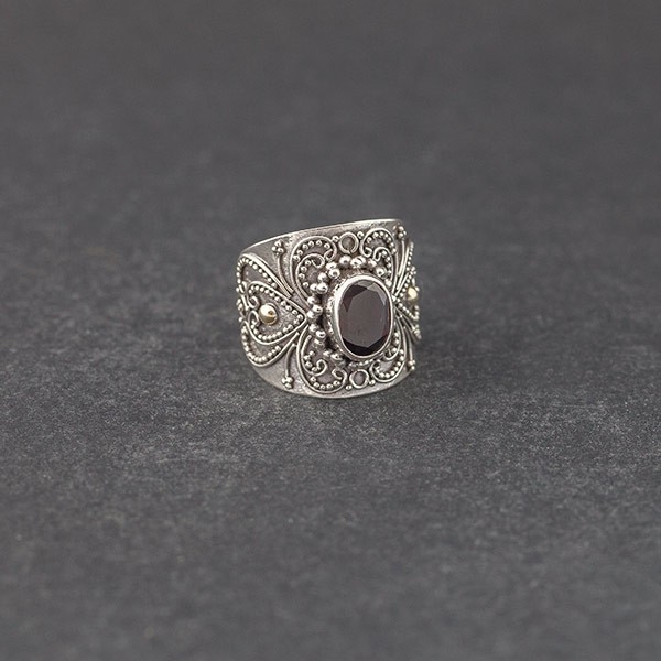 Pierścionek w stylu orientalnym od podstaw wykonany ręcznie ze srebra próby 925 oraz 18-karatowego złota z oprawionym kamieniem granatu. Całość zdobień wykonana ręcznie pracochłonną techniką granulacji. Wielkość kamienia 8x6 mm. Szerokość pierścionka w najszerszym miejscu 19 mm, w najwęższym 5,5 mm. Rozmiar jubilerski 17.