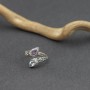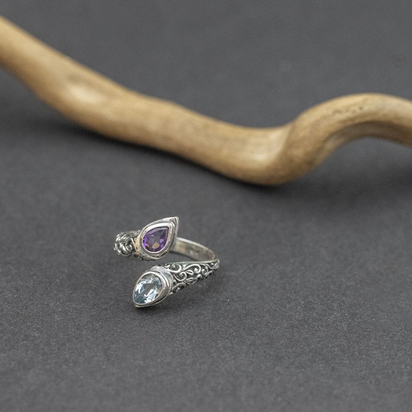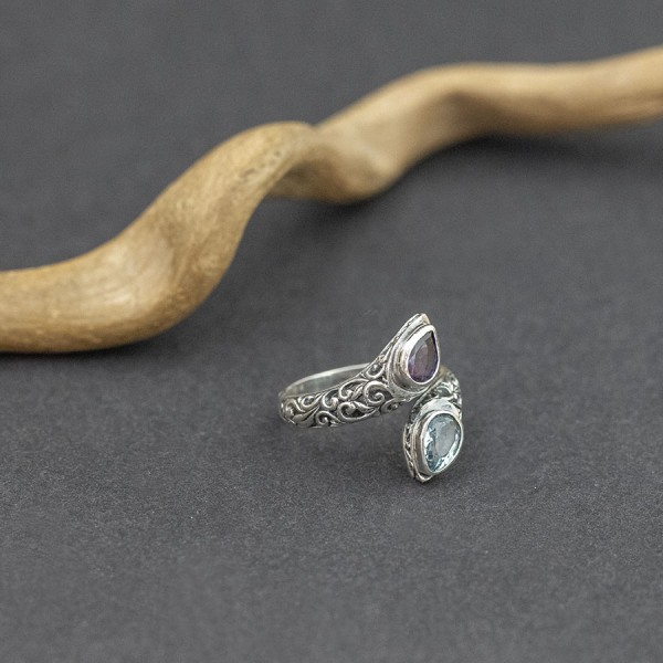 Elegancki pierścionek od podstaw wykonany ręcznie ze srebra próby 925. Pomiędzy zdobieniami oprawione zostały kamienie ametystu i topazu. Wielkość kamieni 5x7 mm. Rozmiar jubilerski 16-17 (pierścionek można wyregulować w przedziale 16-17).