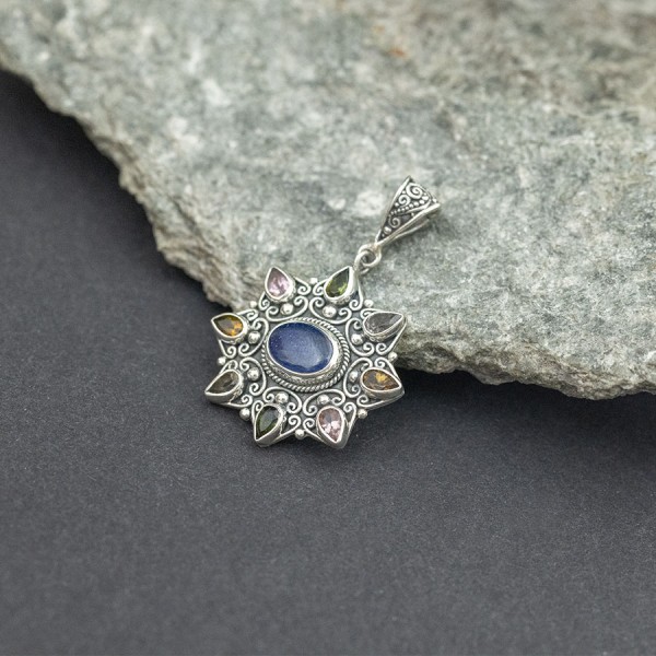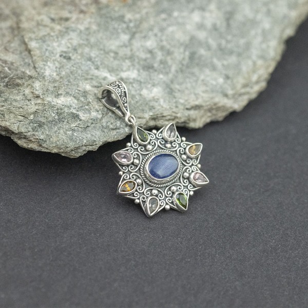 Wisiorek w formie mandali od podstaw wykonany ręcznie ze srebra próby 925 z oprawionym pośrodku kamieniem kyanitu (7x9 mm). Wokół oprawione zostały kamienie turmalinu wielkości 3x5 mm. Wielkość tarczy wisiorka 29x27 mm. Długość całkowita wisiorka 4,2 cm.