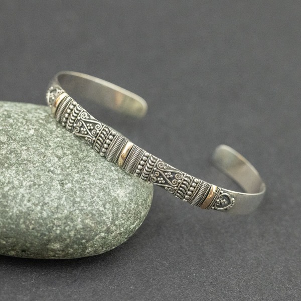 Elegancka bransoletka wykonana ręcznie ze srebra próby 925 oraz 18-karatowego złota. Rozmiar bransoletki regulowany (będzie pasowała na szczupły nadgarstek o obwodzie 15-17 cm). Szerokość obręczy 6,5 mm. Całość zdobień wykonana została ręcznie pracochłonną techniką granulacji.