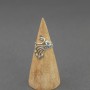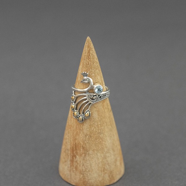 Pierścionek od podstaw wykonana został ręcznie ze srebra próby 925 oraz 18-karatowego złota. Pierścionek zdobi kamień topazu wielkości 4 mm. Rozmiar jubilerski 15. Pojedynczy egzemplarz.