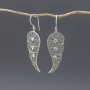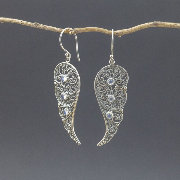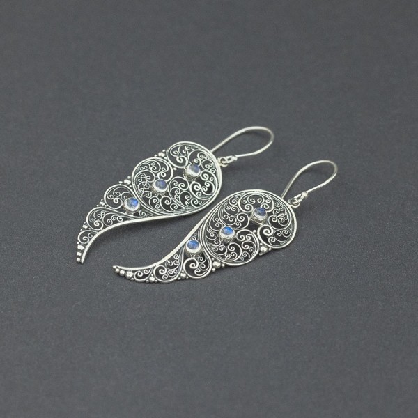 Ażurowe kolczyki od podstaw wykonane zostały ręcznie ze srebra próby 925 oraz kamieni księżycowych. Wielkość kamieni 3 mm. Wielkość tarczy kolczyka 17x42 mm. Długość całkowita kolczyków 6,1 cm.