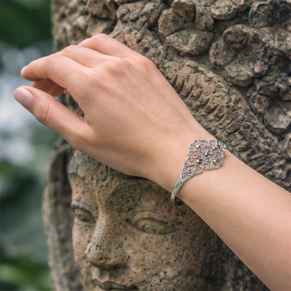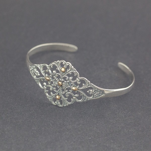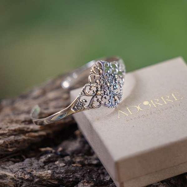 Delikatna ażurowa bransoletka od podstaw wykonana ręcznie ze srebra próby 925 oraz 18-karatowego złota. Bransoletka jest regulowana i będzie pasowała na nadgarstek o obwodzie 16-17 cm.