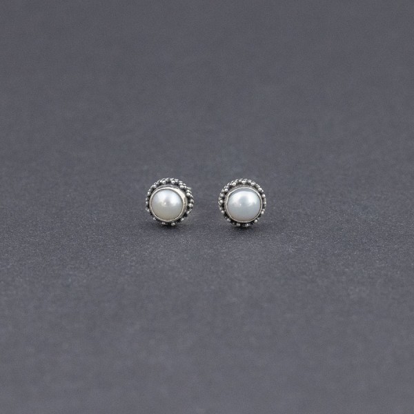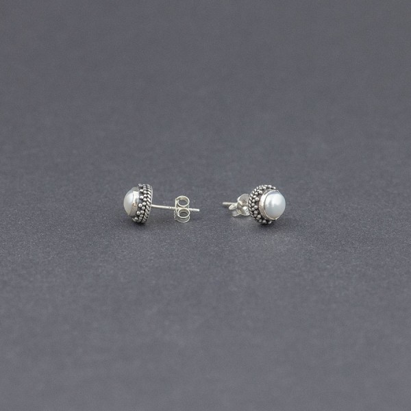 Kolczyki od podstaw wykonane ręcznie ze srebra próby 925 z oprawionym białymi perłami hodowlanymi (6 mm). Wielkość kolczyków 8 mm.
