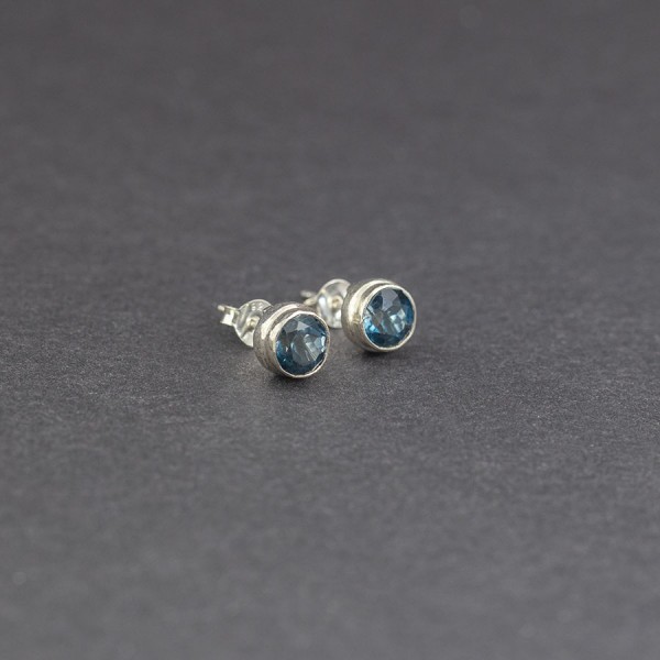 Kolczyki - sztyfty od podstaw wykonane ręcznie ze srebra próby 925 z oprawionymi kamieniami topazu london blue (6 mm). Wielkość kolczyków 7 mm.