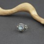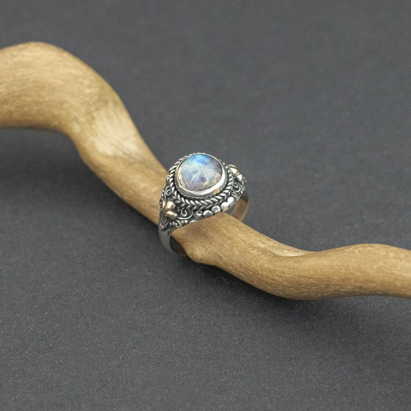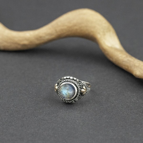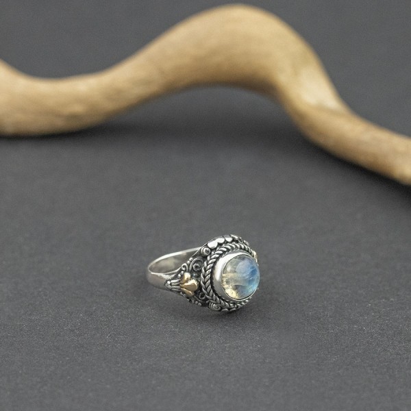Pierścionek w stylu orientalnym od podstaw wykonany ręcznie ze srebra próby 925 oraz 18-karatowego złota z oprawionym kamieniem księżycowym. Całość zdobień wykonana ręcznie pracochłonną techniką granulacji. Wielkość kamienia 12 mm. Rozmiar jubilerski 12.