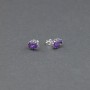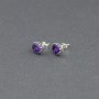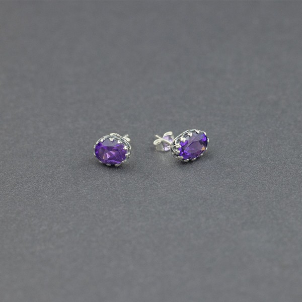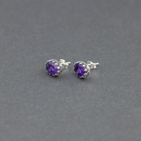 Kolczyki od podstaw wykonane ręcznie ze srebra próby 925 z oprawionymi kamieniami ametystu. Wielkość kolczyków 9,5x7 mm. Całość zdobień wykonana została ręcznie. Sztyft znajduje się w górnej części kolczyka.
