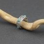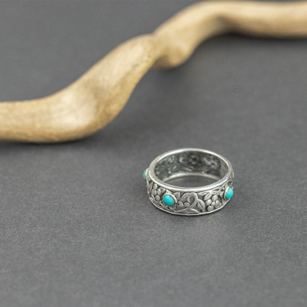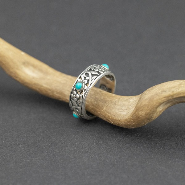 Ażurowy pierścionek od podstaw wykonany został ręcznie ze srebra próby 925 z oprawionymi kamieniami turkusu. Wielkość kamieni 3 mm. Szerokość obrączki 7 mm. Rozmiar jubilerski 15.
