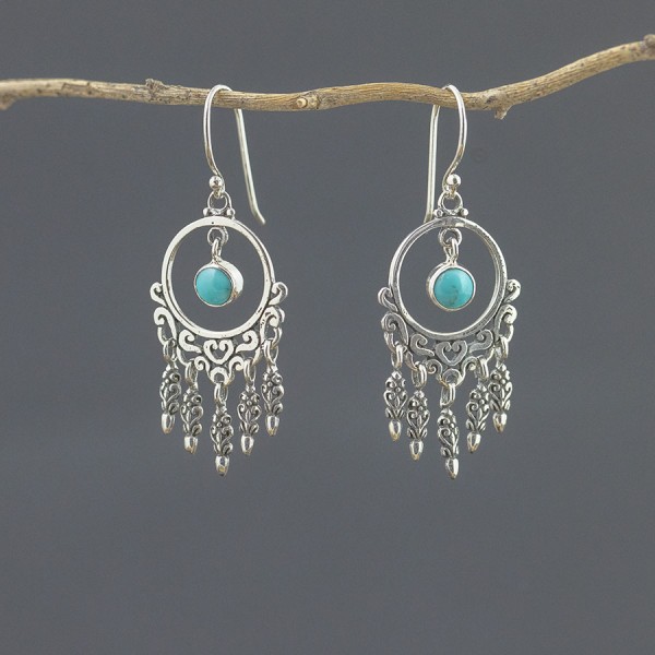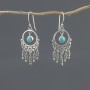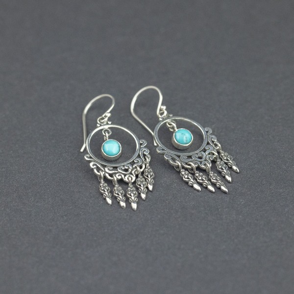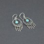 Kolczyki od podstaw wykonane ręcznie ze srebra próby 925 z oprawionym kamieniem turkusu (5 mm). Wielkość ozdobnej tarczy kolczyka 21x18 mm. Długość całkowita kolczyków 5 cm.