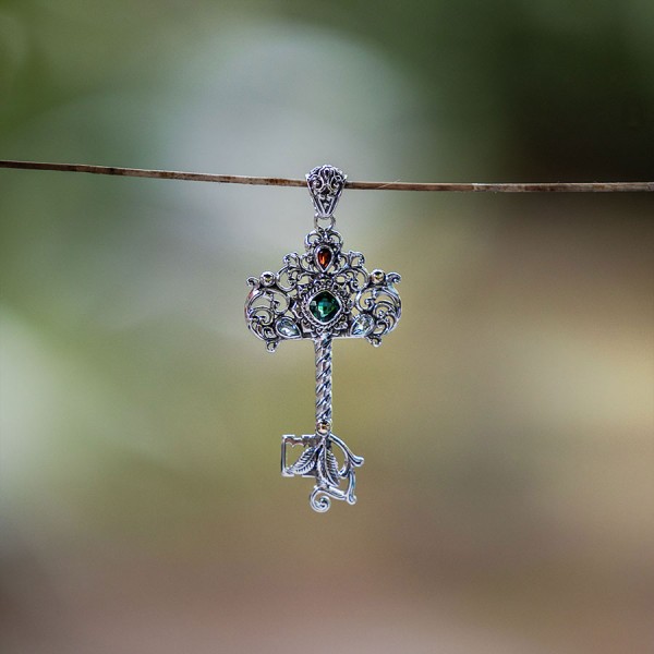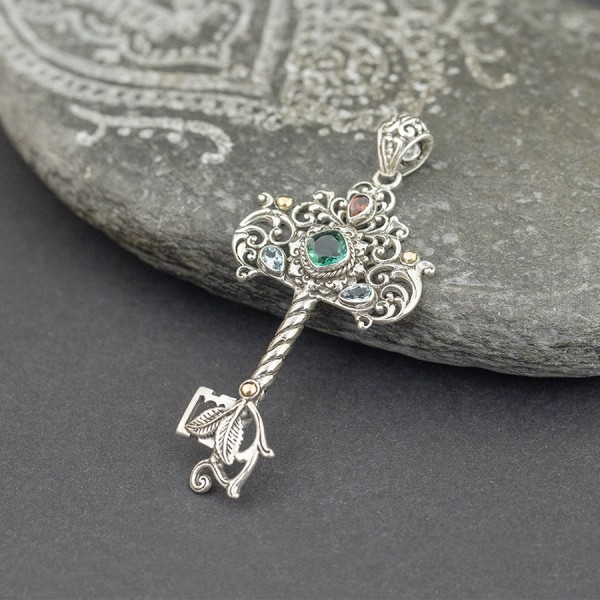 Wisior w formie klucza od podstaw wykonany został ręcznie ze srebra próby 925 oraz 18-karatowego złota. Pomiędzy zdobieniami ością kamienie topazu (5x3 mm), granatu (5x3 mm), kwarcu zielonego (7 mm). Wielkość kluczyka 32x57 mm. Długość całkowita wisiorka 6,9 cm.