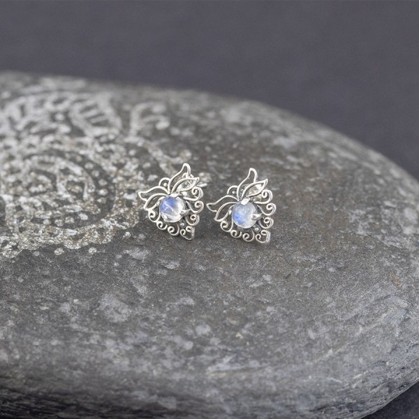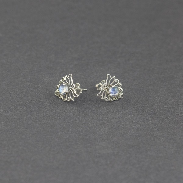 Kolczyki z motywem kwiatu lotosu od podstaw wykonane zostały ręcznie ze srebra próby 925 oraz kamieni księżycowych. Wielkość kamieni 5 mm. Wielkość kolczyków 12 mm. Sztyft umieszczony jest w górnej części kolczyka.