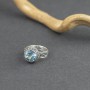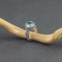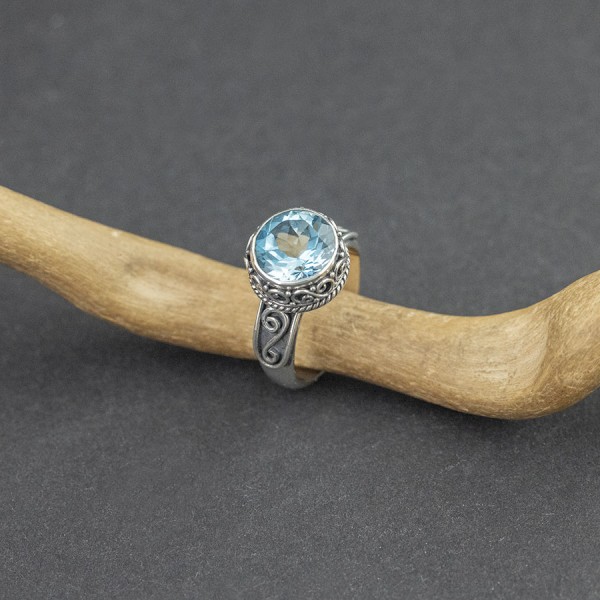 Elegancki pierścionek w całości wykonany ręcznie ze srebra próby 925 oraz błękitnego topazu (10 mm). Kamień z boku ozdobiony został pięknym, ręcznie wykonanym ornamentem. Wielkość tarczy pierścionka 12 mm. Rozmiar jubilerski pierścionka 13.