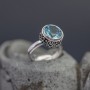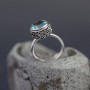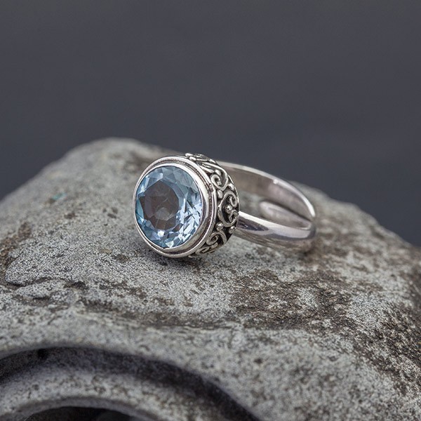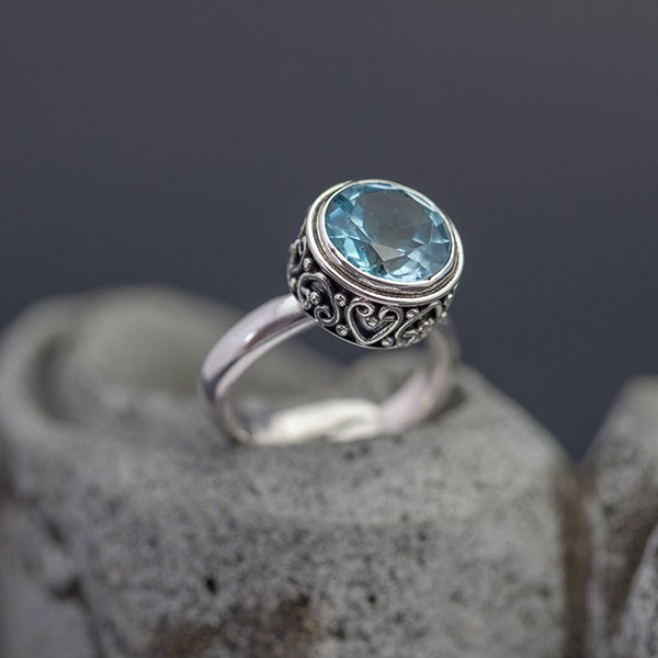 Elegancki pierścionek wykonany ze srebra próby 925 oraz błękitnego topazu (10 mm). Pierścionek ozdobiony został z boku pięknym ornamentem. Całość zdobień wykonana ręcznie. Wielkość tarczy pierścionka 12,5 mm. Rozmiar regulowany (rozmiar wyjściowy 13).