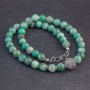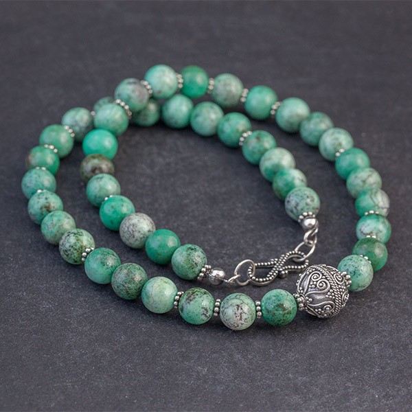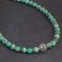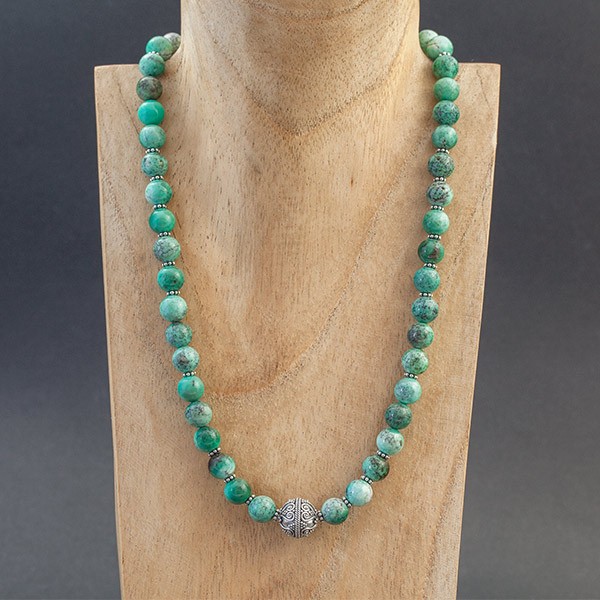 Naszyjnik w orientalnym stylu wykonany od podstaw ręcznie ze srebra próby 925 oraz kamieni chryzoprazu (9 mm). Kamienie ozdobiłam srebrnymi przekładkami bali oraz ręcznie wykonaną kuleczką wielkości 13 mm. Całość zdobień na kuleczce wykonana została ręcznie, pracochłonną techniką granulacji. Naszyjnik posiada ozdobne zapięcie nawiązujące do całości. Długość naszyjnika 45,5 cm.