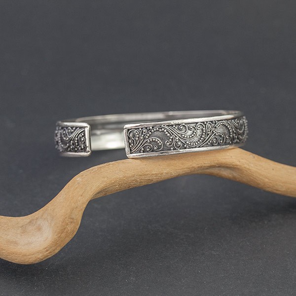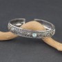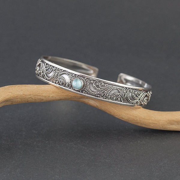 Elegancka bransoletka w całości wykonana ręcznie pracochłonną techniką granulacji. Obręcz bransoletki została bogato ozdobiona orientalnymi motywami typowymi dla balijskiego wzornictwa. Pośród zdobień oprawiony został kamień larimaru (5 mm). Całość srebrna, próba 925. Szerokość obręczy 10 mm. Bransoletka jest regulowana (będzie pasowała na nadgarstek 15,5-17,5 cm).