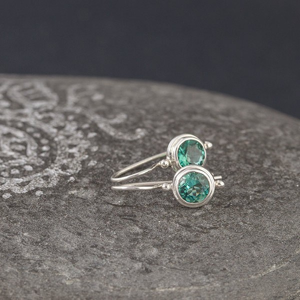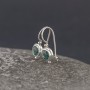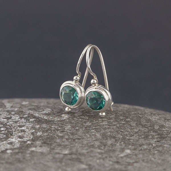 Kolczyki od podstaw wykonane ręcznie ze srebra próby 925 oraz kwarcu zielonego. Wielkość kamienia 6 mm; wielkość tarczy kolczyka 8 mm. Długość całkowita kolczyków 2 cm.