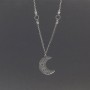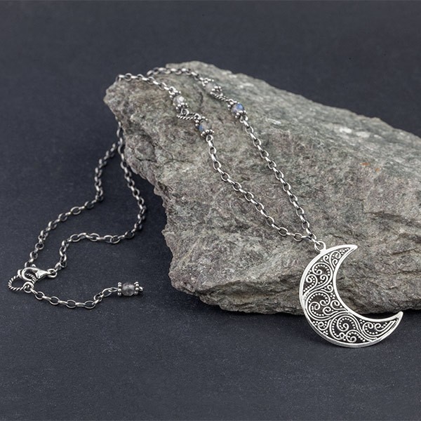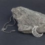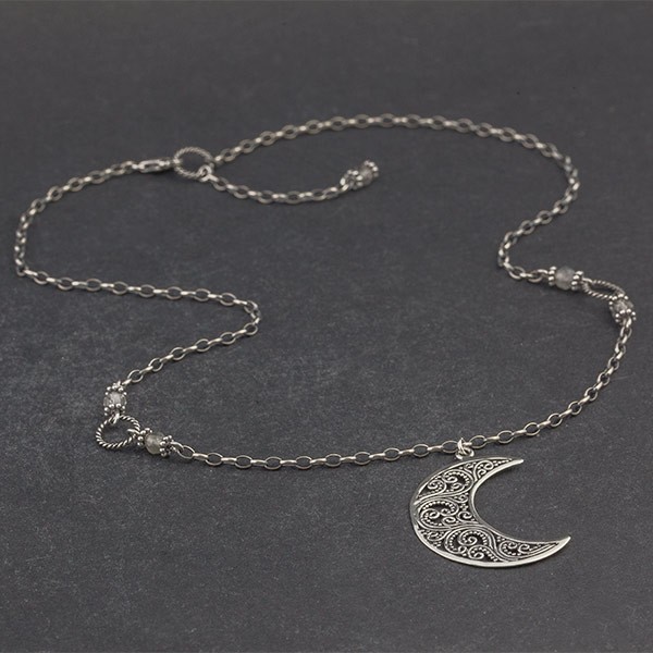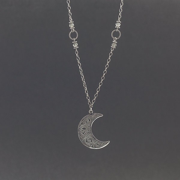 Naszyjnik wykonany ze srebra próby 925 oraz kamieni labradorytu (4 mm). Główną ozdobę naszyjnika stanowi ażurowy, wisior w kształcie księżyca wielkości 29x11 mm. Księżyc wykonany został całkowicie ręcznie, techniką granulacji, z misternie zdobioną powierzchnią. W łańcuszek wplotłam kamienie labradorytu. Długość naszyjnika 42 cm + 3 cm łańcuszka wydłużającego zakończonego przywieszką z kamieniem labradorytu.