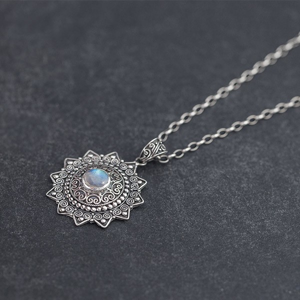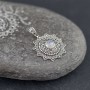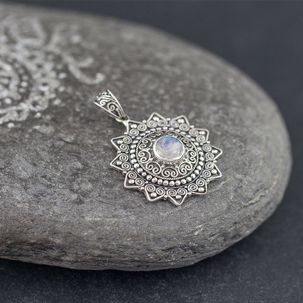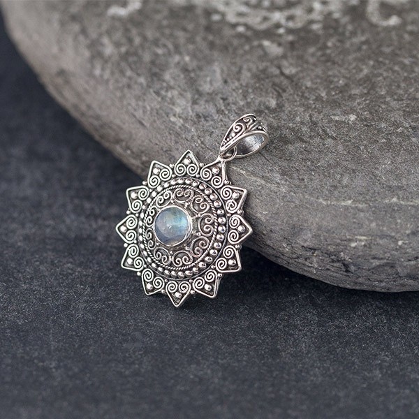 Wisiorek z kamieniem księżycowym od podstaw wykonany ręcznie ze srebra próby 925. Całość zdobień wykonana została ręcznie pracochłonną techniką granulacji. Wielkość kamienia 7 mm. Wielkość tarczy wisiorka 27 mm. Długość całkowita wisiorka 3,8 cm.