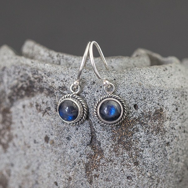 Drobne kolczyki, od podstaw wykonane ręcznie ze srebra próby 925 z oprawionymi kamieniami labradorytu. Wielkość kamieni 6 mm. Wielkość tarczy kolczyka 9 mm. Długość całkowita kolczyków 2,4 cm. Kolczyki stworzone z myślą o Paniach lubiących drobną biżuterię.