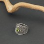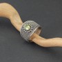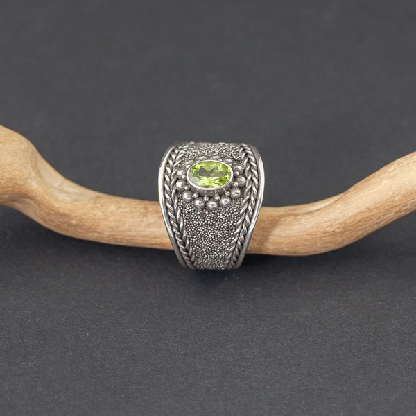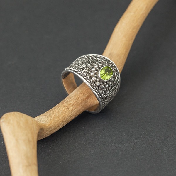 Pierścionek w stylu orientalnym od podstaw wykonany ręcznie ze srebra próby 925 z oprawionym kamieniem peridotu. Całość zdobień wykonana ręcznie pracochłonną techniką granulacji. Wielkość kamienia 5x7 mm. Szerokość pierścionka w najszerszym miejscu 17,5 mm, w najwęższym 6 mm. Rozmiar jubilerski 18.