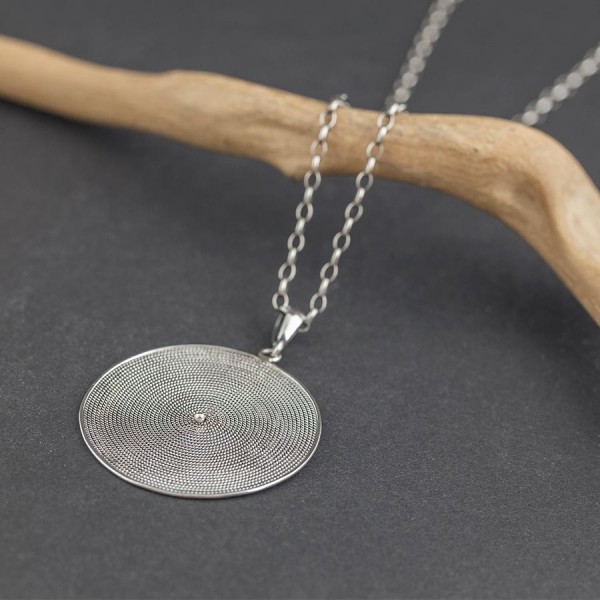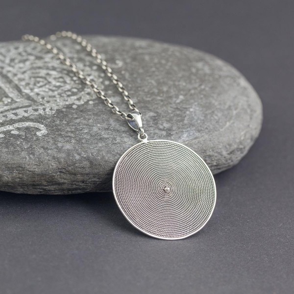 Wisior od podstaw wykonany ręcznie ze srebra próby 925. Wielkość tarczy wisiorka 35 mm. Długość całkowita wisiorka 4,7 cm.