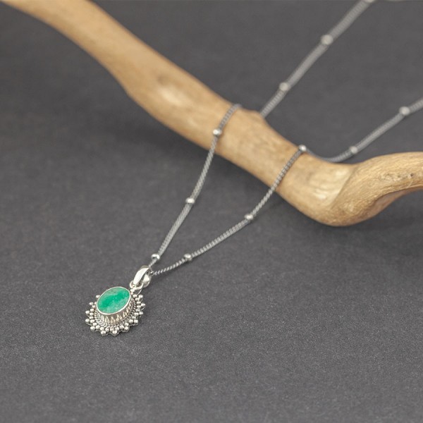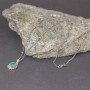 Kamień szmaragdu ubrany w srebro próby 925. Całość zdobień wykonana ręcznie. Wielkość kamienia 6x8 mm. Wielkość tarczy wisiorka 11x13 mm. Długość całkowita wisiorka 2,1 cm. Wisiorek zawiesiłam na łańcuszku długości 42,5 cm.