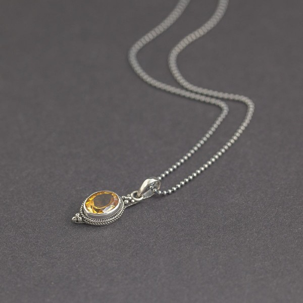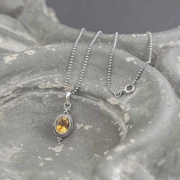 Kamień cytrynu ubrany w srebro próby 925. Całość zdobień wykonana ręcznie. Wielkość kamienia 7x9 mm. Wielkość tarczy wisiorka 9x11 mm. Długość całkowita wisiorka 2,4 cm. Wisiorek zawiesiłam na łańcuszku długości 45 cm.
