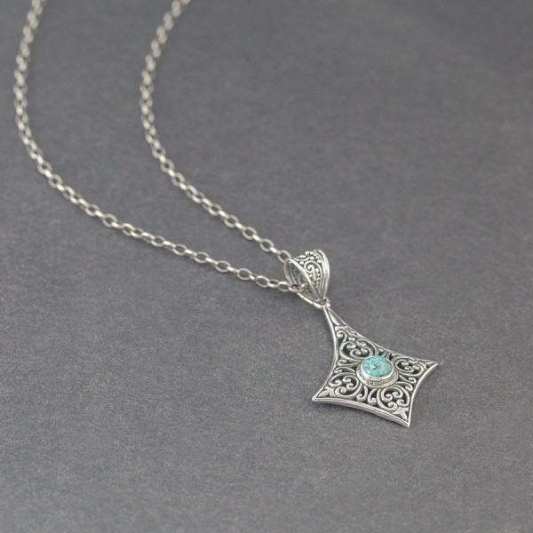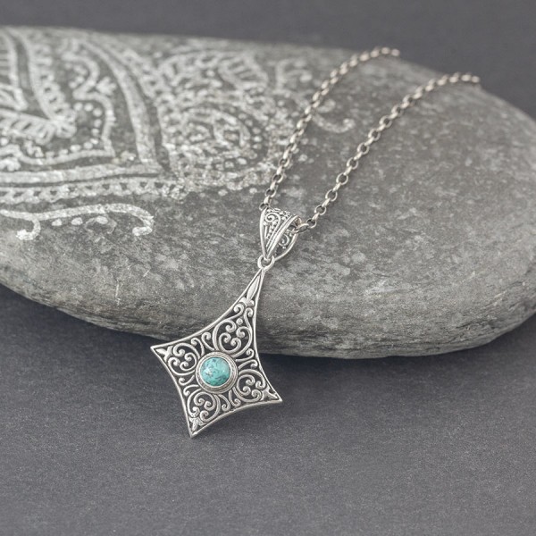 Ażurowy wisiorek w orientalnym stylu, wykonany został ręcznie ze srebra próby 925 z oprawionym kamieniem turkusu. Wielkość kamienia 5 mm Wielkość tarczy wisiora 35x27 mm. Długość całkowita wisiorka 4,3 cm.