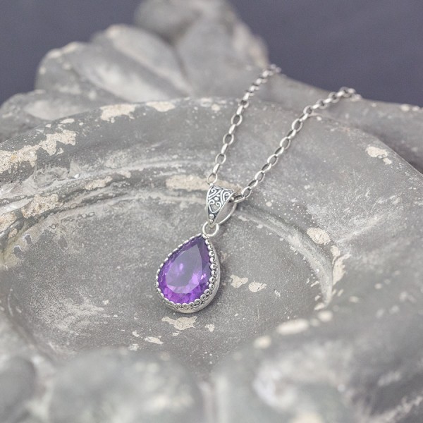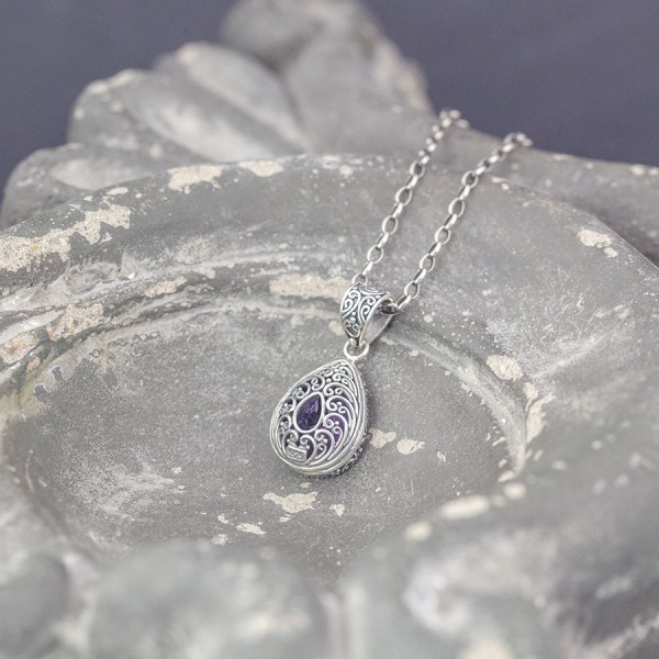 Niezwykłej urody wisiorek od podstaw wykonany ręcznie ze srebra próby 925 z oprawionym kamieniem ametystu. Kamień ubrany został w ręcznie zdobione, ażurowe srebro przez co przepuszczając światło pięknie się mieni. Wielkość kamienia 12x16 mm. Wielkość tarczy wisiorka 13x17 mm. Długość całkowita wisiorka 2,9 cm.