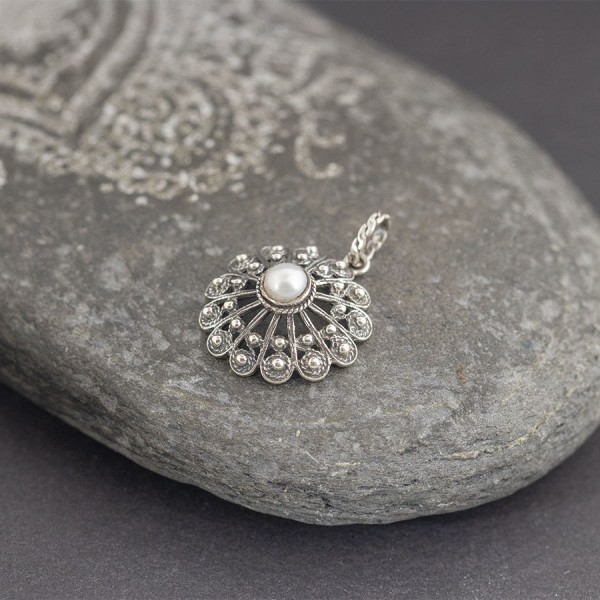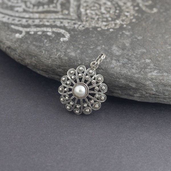 Wisiorek od podstaw wykonany został ręcznie ze srebra próby 925 z oprawiona białą perłą słodkowodną (6 mm). Wielkość tarczy wisiorka 23 mm. Długość całkowita wisiorka 3,3 cm.