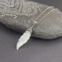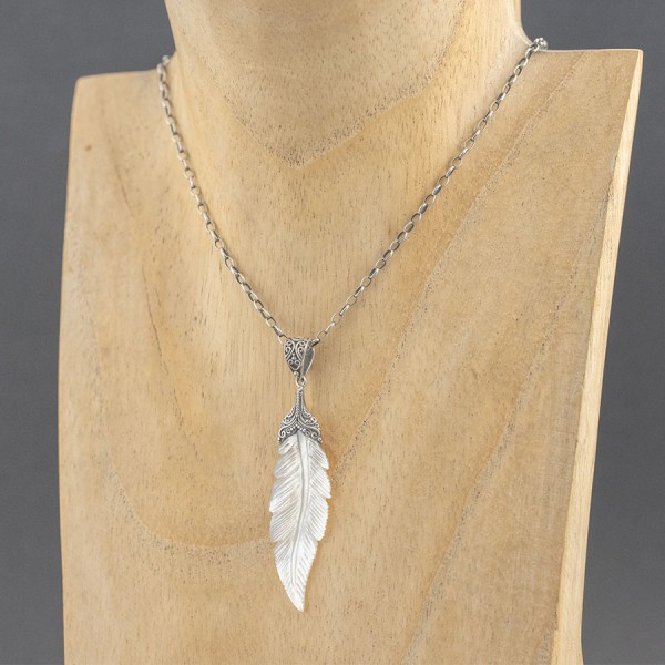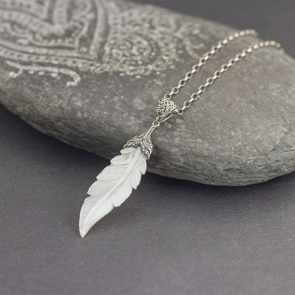 Piórko z masy perłowej oprawione w ręcznie zdobione srebro próby 925. Wielkość piórka 40x13 mm. Długość całkowita wisiorka 5,8 cm.