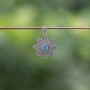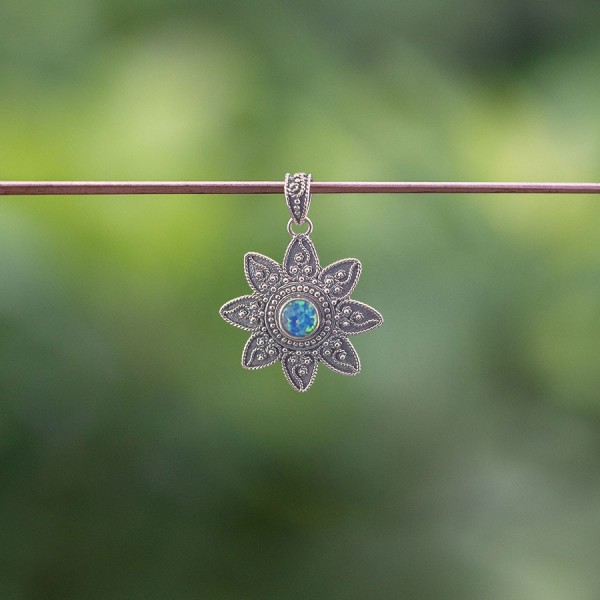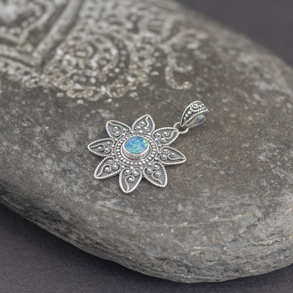 Wisiorek z oprawionym w srebro kamieniem opalu australijskiego (6 mm) od podstaw wykonany ręcznie pracochłonną techniką granulacji. Wielkość tarczy wisiorka 25x25 mm. Długość całkowita wisiorka 3,4 cm.