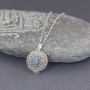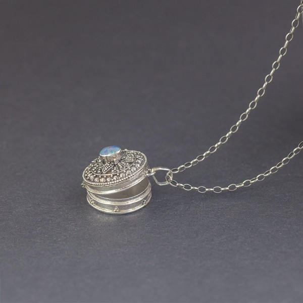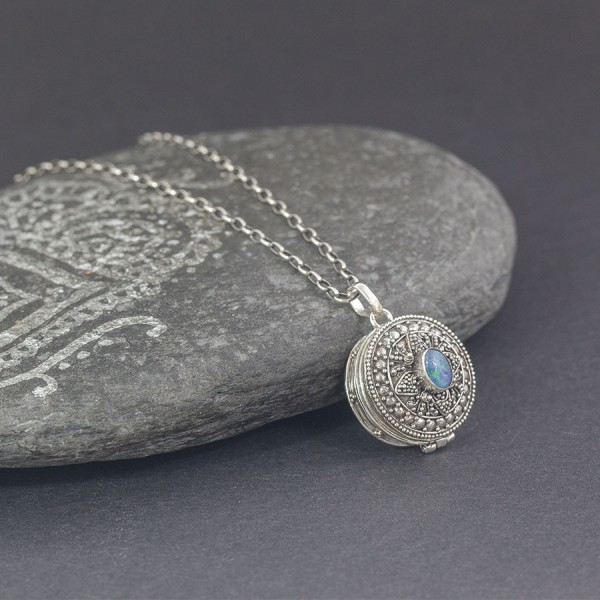 Srebrny wisior w formie sekretnika, wykonany ręcznie, z misternie zdobioną powierzchnią i kamieniem opalu (triplet). Wielkość kamienia 5x7 mm. Sekretnik jest otwierany, do środka można włożyć zdjęcie lub bliski nam przedmiot. Elementy wykończeniowe wykonane z oksydowanego srebra próby 925. Wielkość sekretnika 2,2 x 2,2 cm. Długość całkowita wisiora 3,2 cm. Doskonały na prezent dla bliskiej osoby.
