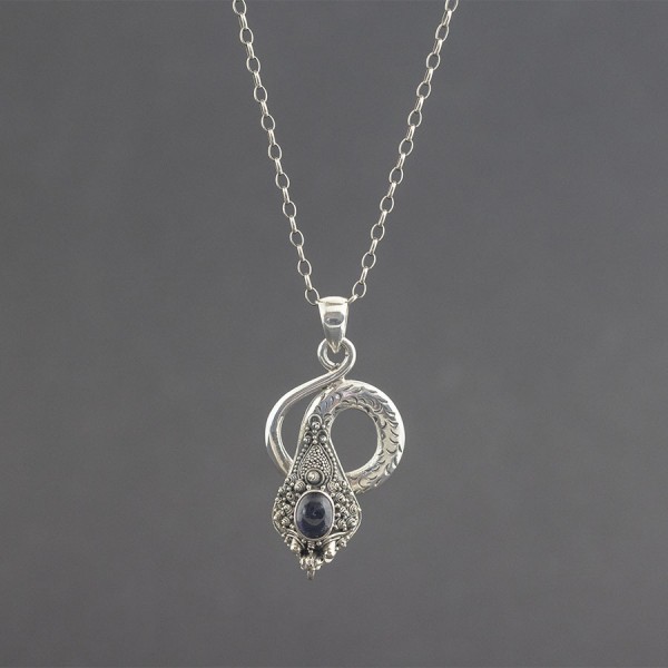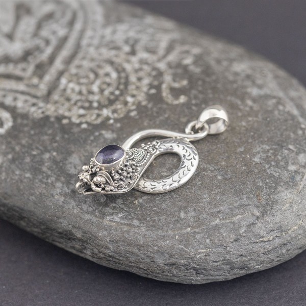Wisior z motywem balijskiego smoka, w całości wykonany ręcznie ze srebra próby 925 z oprawionym kamieniem iolitu (8x6 mm). Wielkość wisiora 35x23 mm. Długość całkowita wisiorka 4,7 cm.