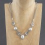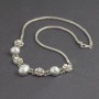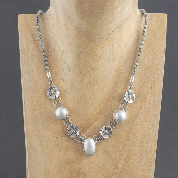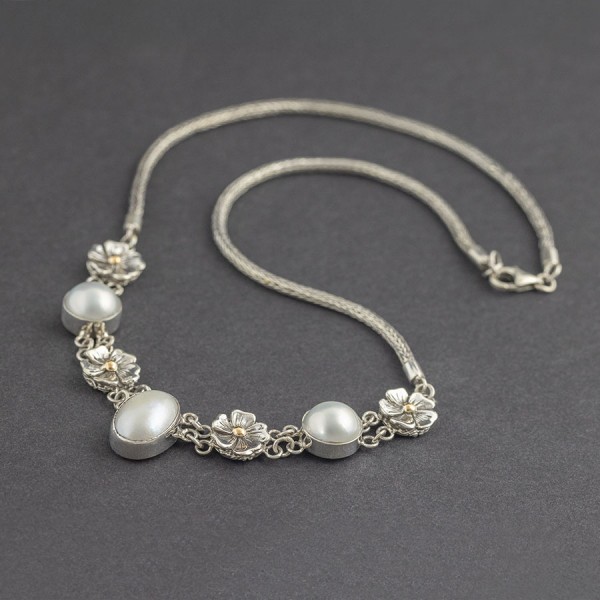 Elegancki naszyjnik od podstaw wykonany został ręcznie ze srebra próby 925 z oprawioną masą perłową (15x11 mm i 11 mm). Łączniki w formie kwiatków (12 mm) otrzymały środki z 18-karatowego złota. Łańcuszek o grubości 2,5 mm upleciony został ręcznie. Długość naszyjnika 47 cm. Pojedynczy egzemplarz!
