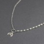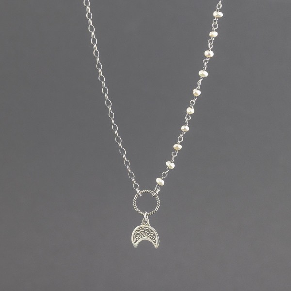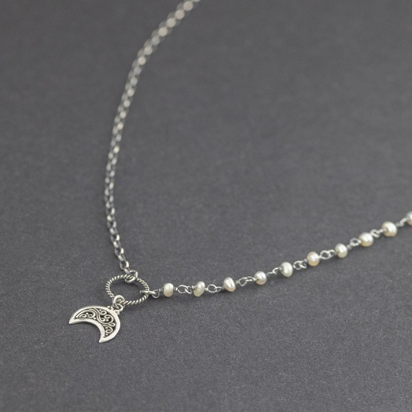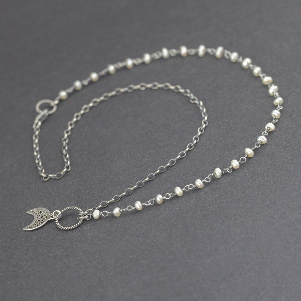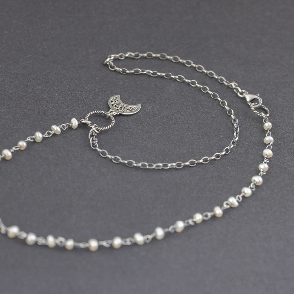 Naszyjnik od podstaw wykonany został ręcznie ze srebra próby 925 oraz białych perełek słodkowodnych (2x3,5 mm). Naszyjnik ozdabia przez`ywieszka w formie półksiężyca wielkości 6x11 mm. Długość naszyjnika 45 cm.