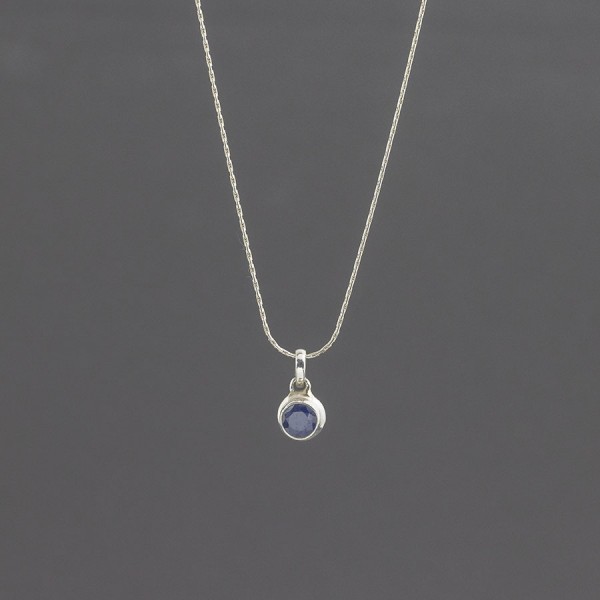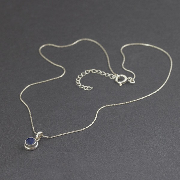 Delikatny wisiorek od podstaw wykonany ręcznie ze srebra próby 925 z oprawionym kamieniem szafiru. Wielkość kamienia 6 mm. Wielkość tarczy wisiorka 8 mm. Długość wisiorka 1,4 cm. Wisiorek zawiesiłam na srebrnym łańcuszku długości 40 cm + 5 cm łańcuszka wydłużającego. Naszyjnik stworzony z myślą o Paniach lubiących drobną biżuterię.
