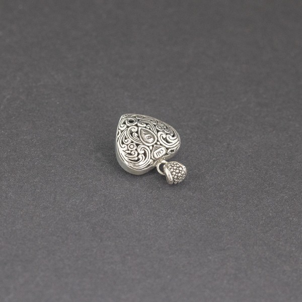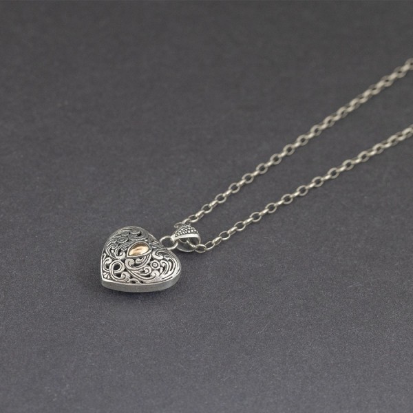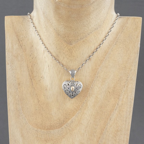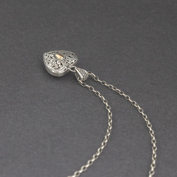 Elegancki wisiorek w kształcie serca od podstaw wykonany ręcznie ze srebra próby 925 oraz 18-karatowego złota. Wielkość serduszka 19x18 mm. Długość całkowita wisiorka 2,7 cm. Wisiorek ozdobiony jest dwustronnie.