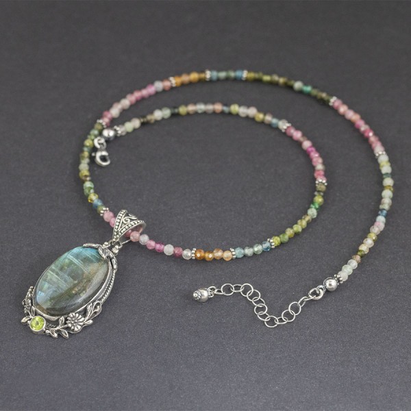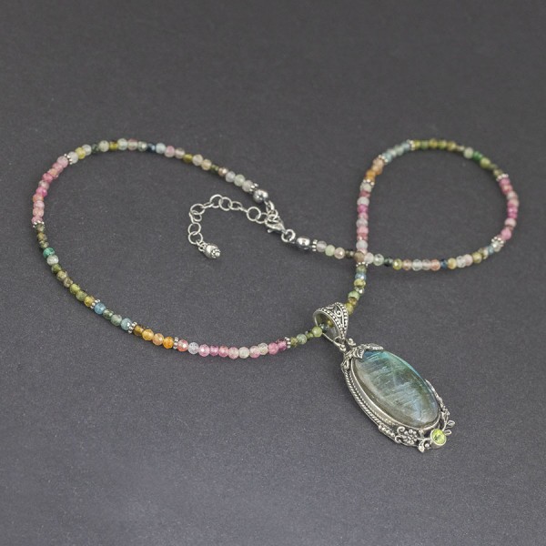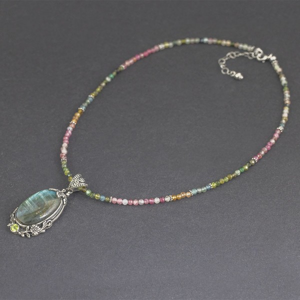 Naszyjnik z kamieni turmalinu od podstaw wykonany został ręcznie ze srebra próby 925. Wielkość kamieni 3 mm. Na sznurze turmalinu zwiesiłam wisiorek z oprawionym kamieniem labradorytu (17x30 mm) i peridotu (4 mm). Długość całkowita wisiorka 5,2 cm. Wisiorek można zdjąć ze sznura turmalinów i nosić naszyjnik jako kolię lub zawiesić na nim inny ulubiony wisiorek. Długość naszyjnika z turmalinu 42 cm + 4,5 cm łańcuszka wydłużającego.